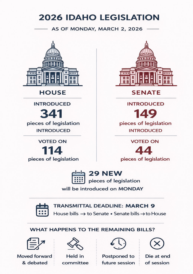 As of March 2, nearly 500 pieces of legislation have been introduced in the Idaho Legislature. More are being filed daily as we approach the March 9 transmittal deadline.